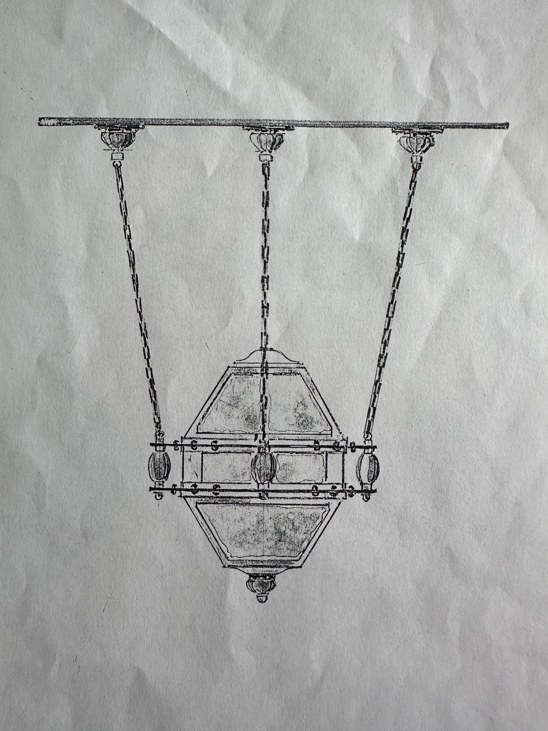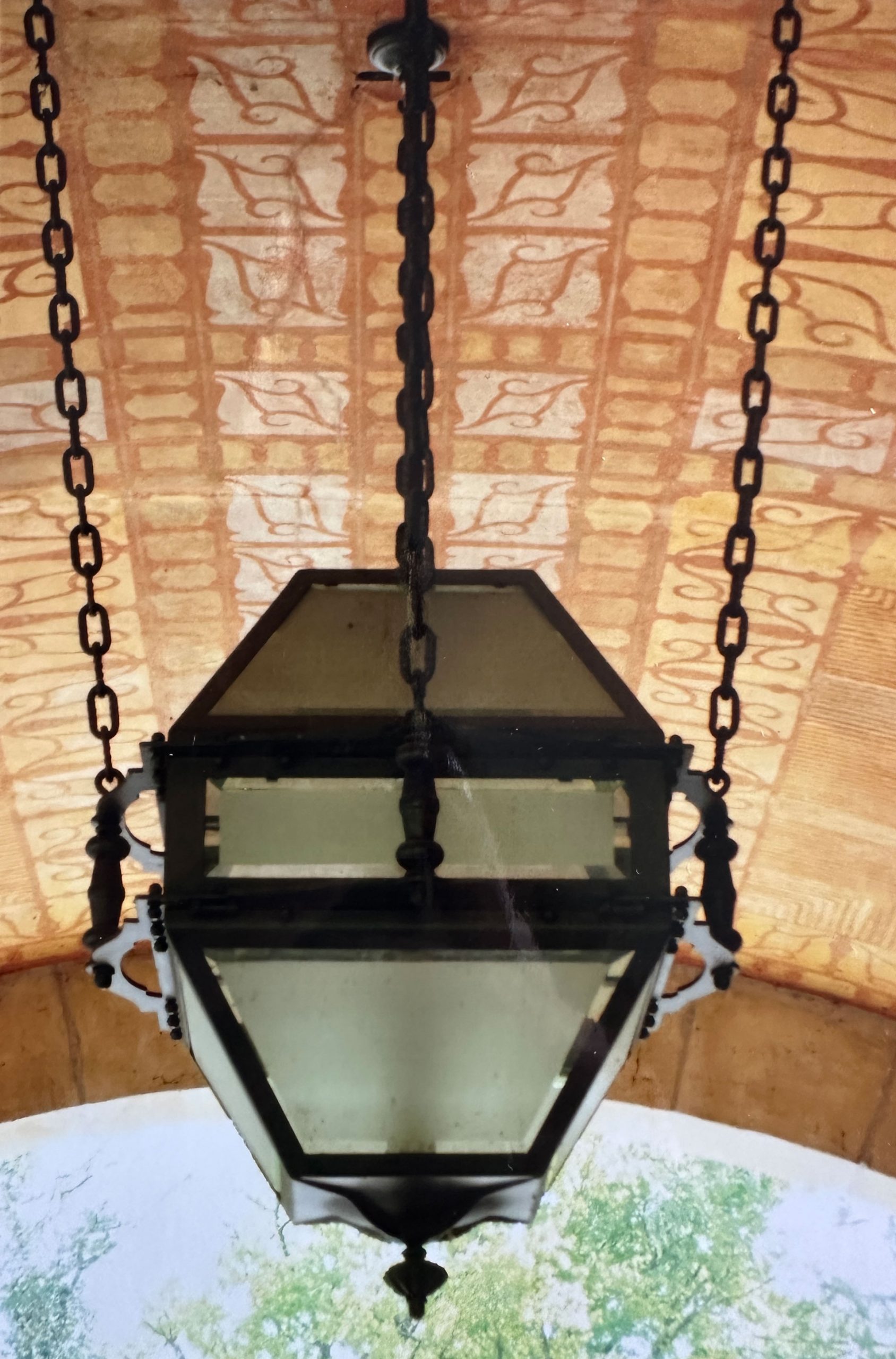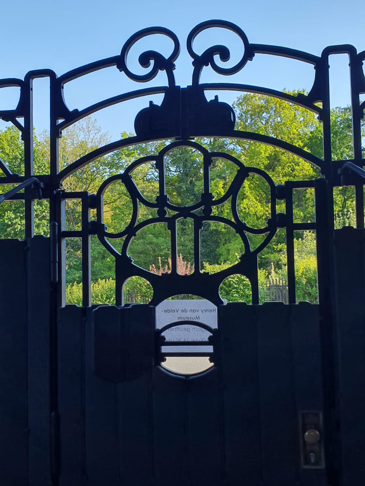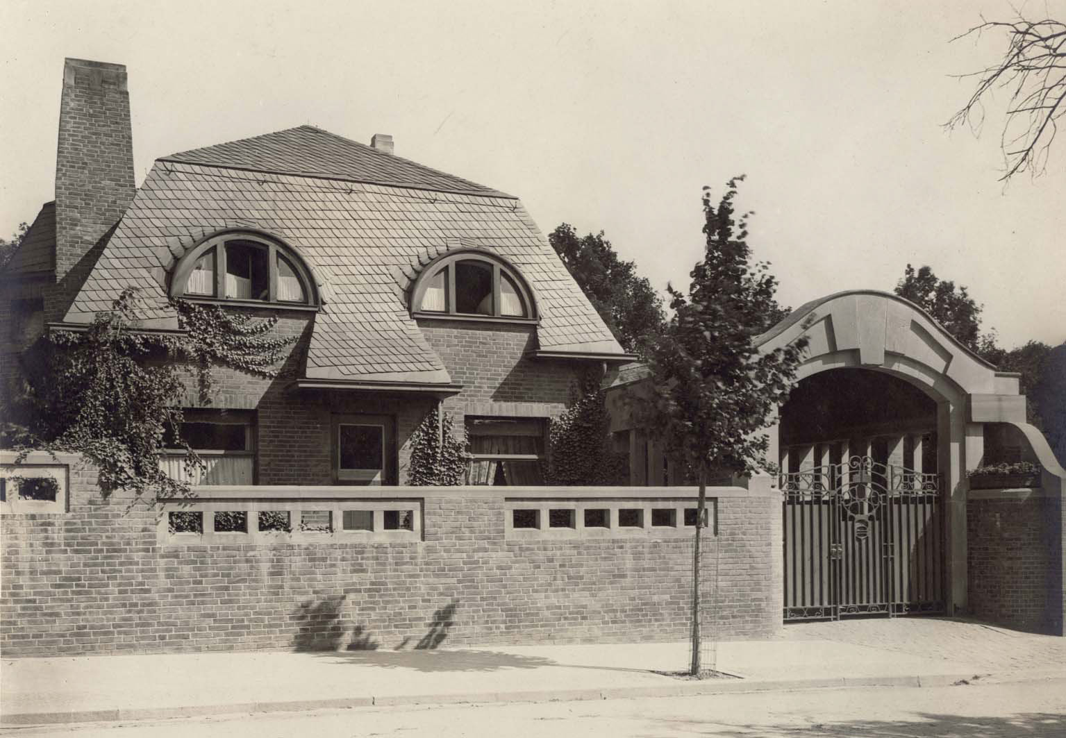 The covered gateway to the Schulenburg estate is an elaborate sandstone structure that resembles one of van de Velde’s designs for an unrealised Nietzsche monument. The three-leaf gate made of forged and riveted iron parts, the ornamental stencil painting of the archway, which is held in place by hanging iron rods as a “Rabitz ceiling”, the large quadruple suspended lamp, the bench in front of the entrance to the chauffeur’s residence and even the geometric edging of the driveway floor were all conceived and designed by van de Velde as a unit. It is interesting to note how van de Velde found a similar formal language in both the large and the small (iron gate/book ornament).