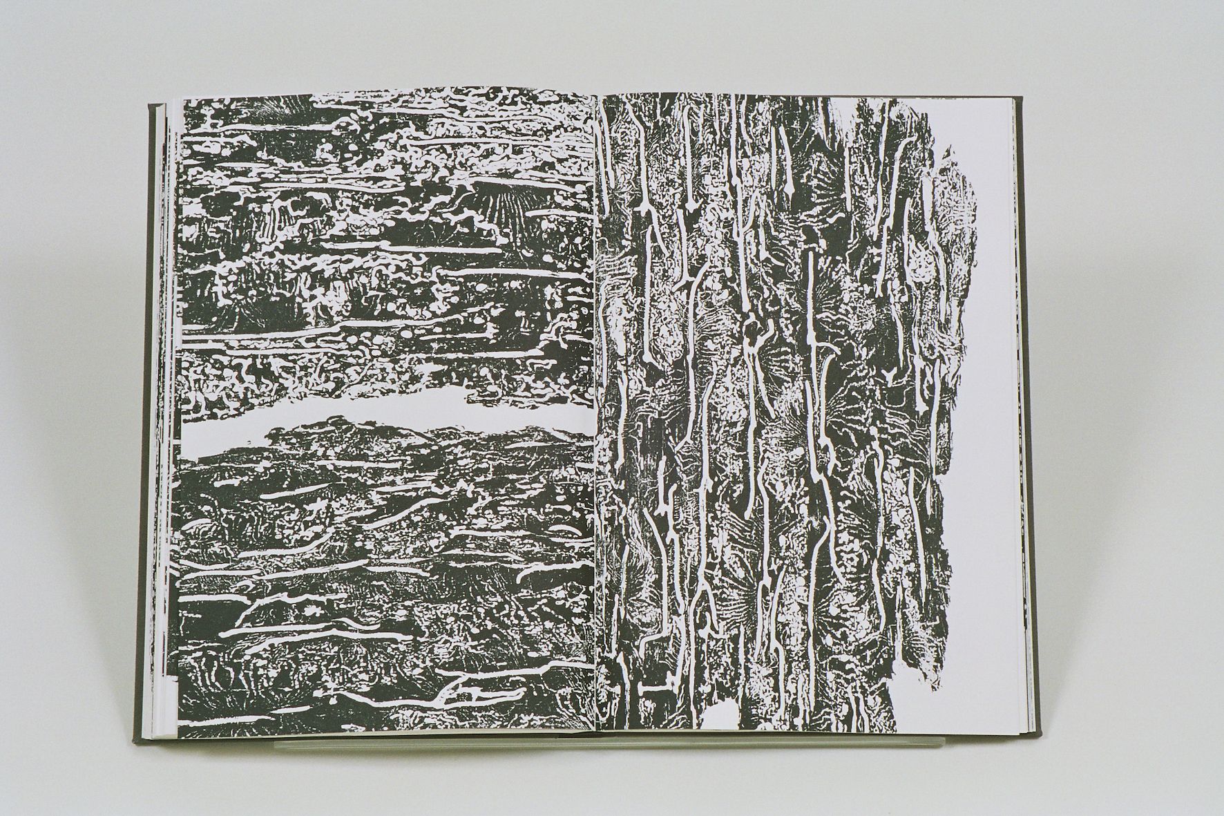 Sein Künstlerbuch «Ips typographus L.» ließ Heckwolf den Borkenkäfer selbst schreiben. Die direkt abgedruckten Fraßgänge von der Rinde der Gemeinen Fichte ergeben eine «lesbare» Textur.